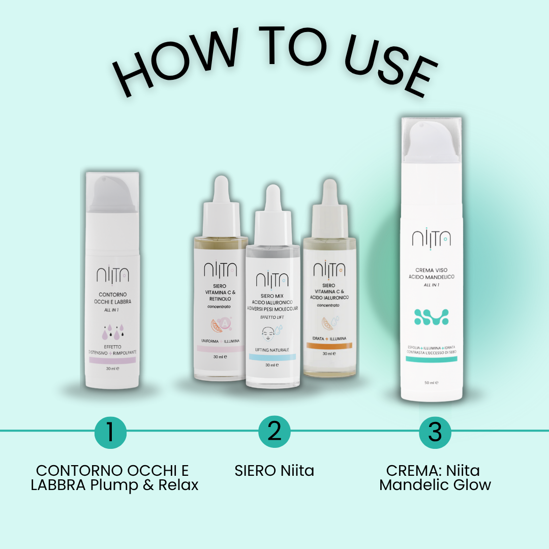 I sieri contengono più alte concentrazioni di principi attivi per trattare specifiche esigenze della pelle. Applica i Sieri Niita ogni giorno e massaggia fino all'assorbimento.