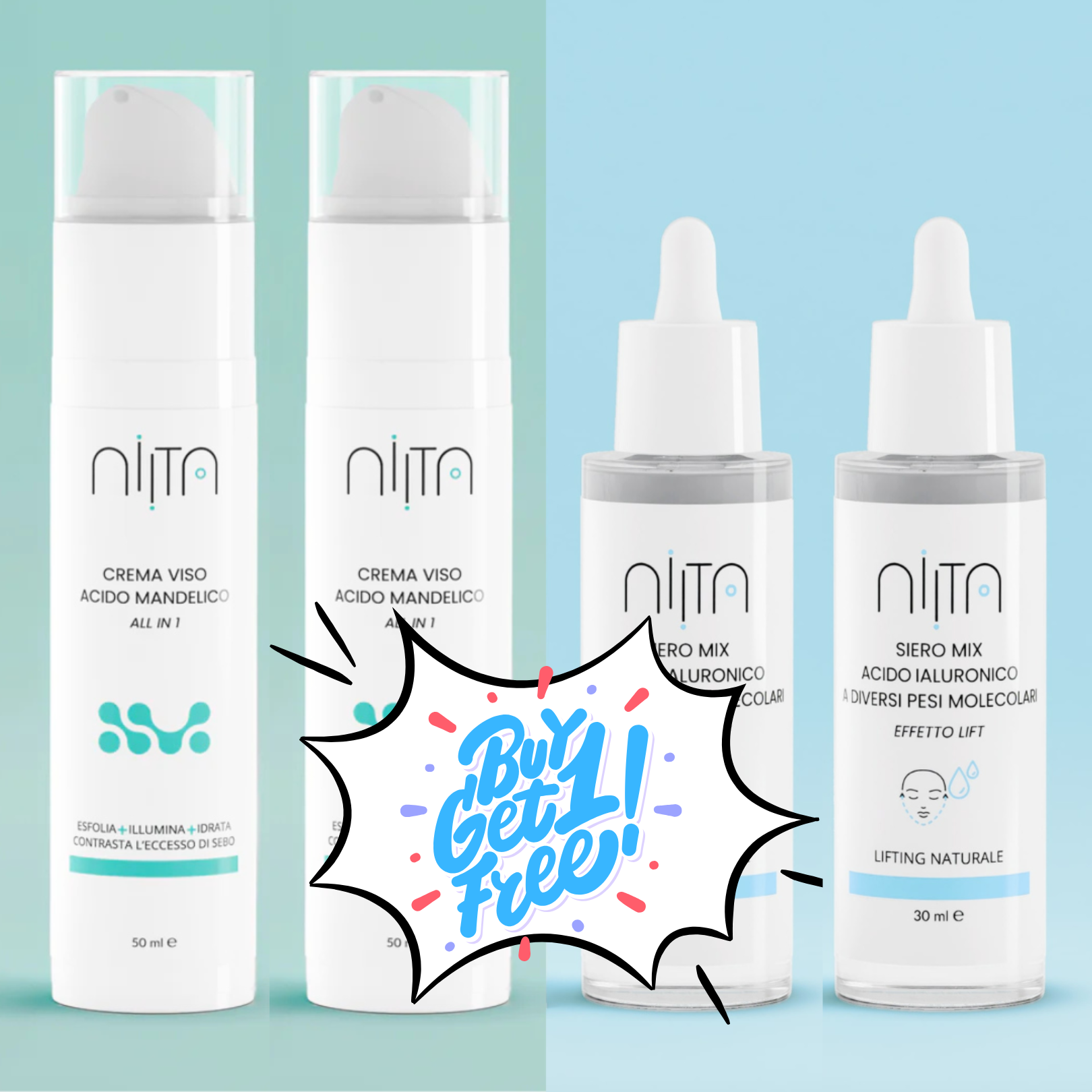 - Gentilezza sulla pelle: Acido mandelico e Acido ialuronico a più pesi molecolari – i pesi differenti permettono di penetrare in differenti strati delle pelle.